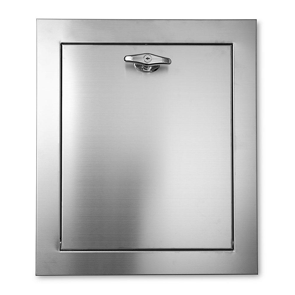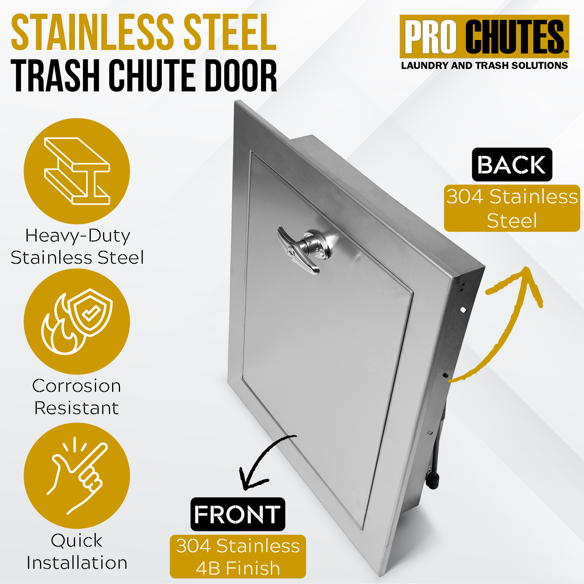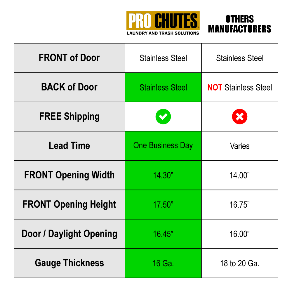 • The only door on the market made of 100% Stainless Steel. Trash and Laundry Replacement Chute Door. Unlike our competitors, the entire Front and BACK of the door are made of stainless steel (Front = 304 Stainless Steel 4B Finish).  These doors are an excellent solution for oceanfront properties because they will not corrode or rust as fast as standard doors.