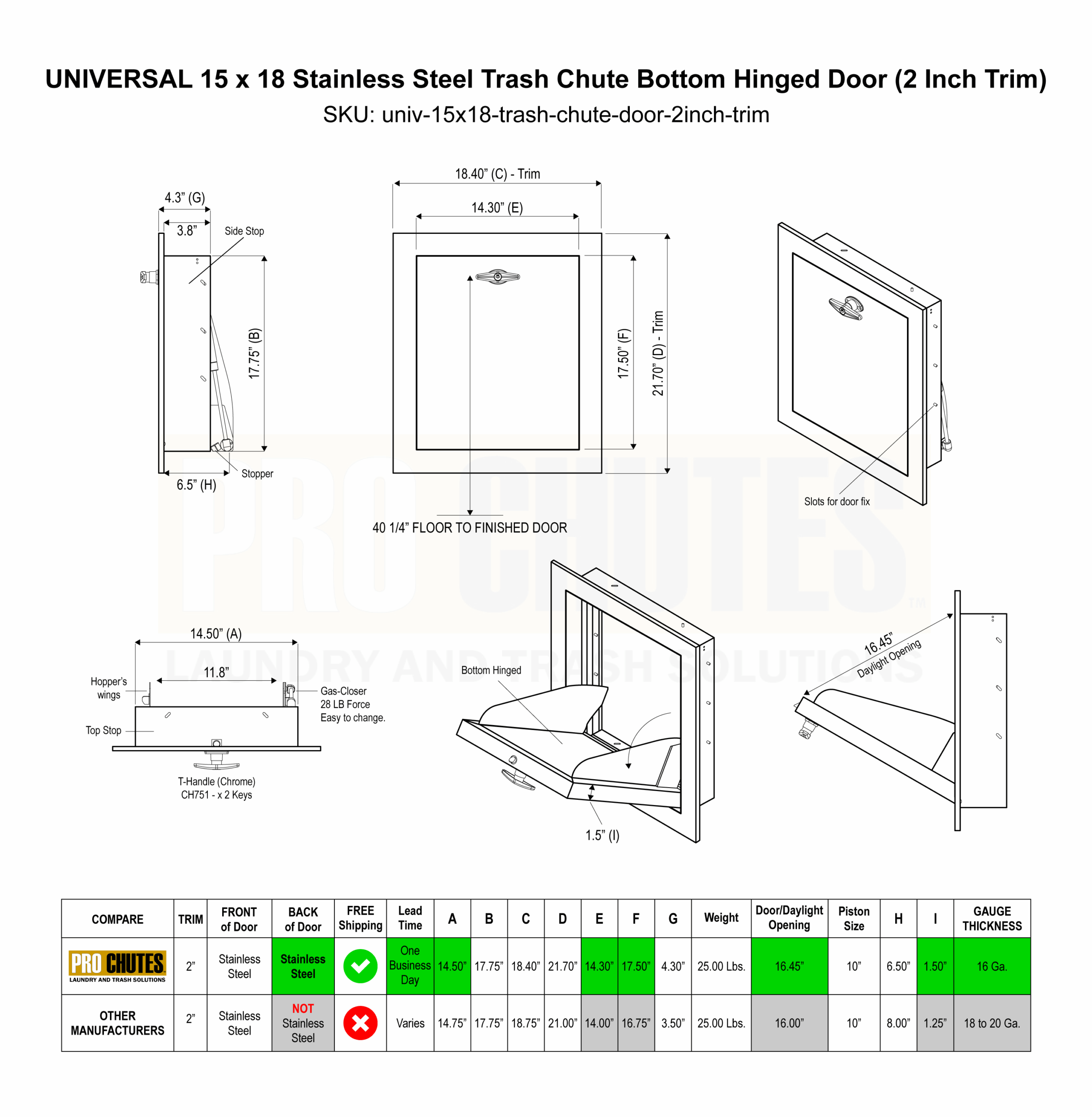 Trash Chute Doors Universal 15 x 18 – 100% Stainless Steel Bottom Hinged Replacement Intake Door (2-inch-trim)